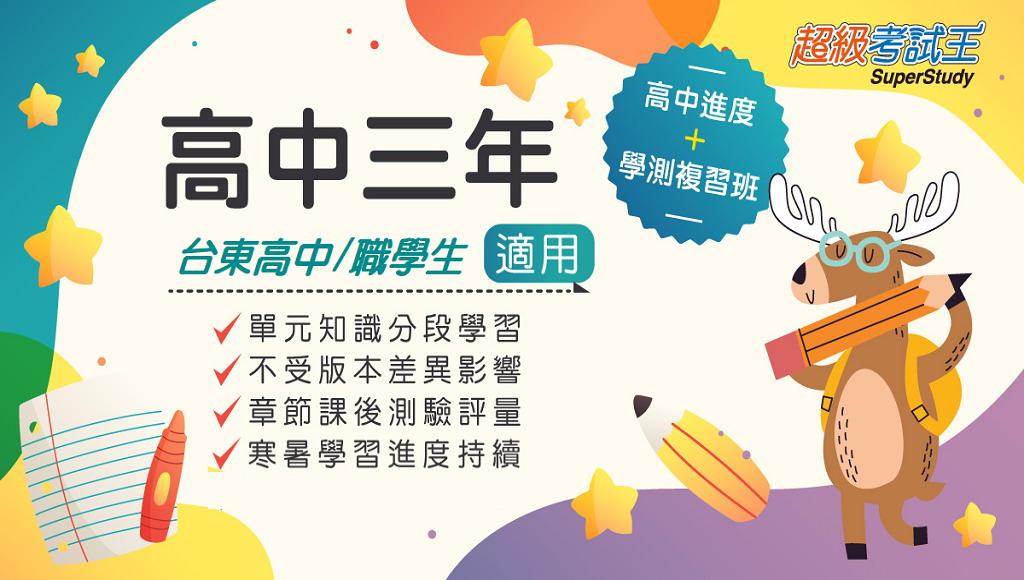 高中課程名師雲端學習,在校成績也能有效保持與進步~新型態雙效學習模式,兼顧彈性與專注,課業發問、線上題庫高效輔助。國高中補習、分科測驗、學測、會考補習。台東限定在地學子優惠價,超級考試王課程全面5折起,另憑學生證再享最高2500元折價劵優惠。邀請您立即預約免費試讀!