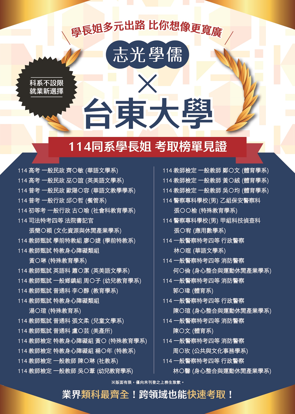 台東志光專辦各類公職補習班國考專家,您是在校生或應屆畢業生嗎?不管您在全國的各大專院校就讀,畢業後後不知道自己以後要做什麼?怕畢業後,為自己所學去找工作,結果工作不如預期!不要煩惱,公職之路是您的最佳選擇,想在鄉公所及公家機關或台東縣政府工作,快來台東志光讓我們告訴您,我們提供多種課程規劃,包含年度班、高分班、二年班、公職超強班、考取班的雙效學習,讓您在學習期間提早準備,贏在起跑點!持各大專院校學生證的同學【皆享有優惠方案,學費最高再折8000元】機會難得不容錯過!速洽台東志光089-343125