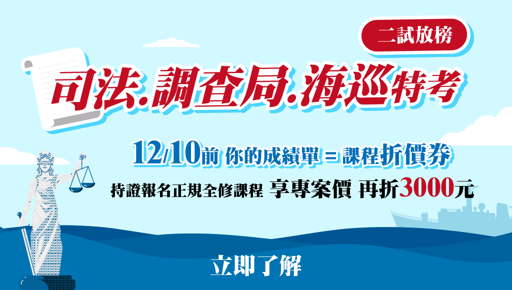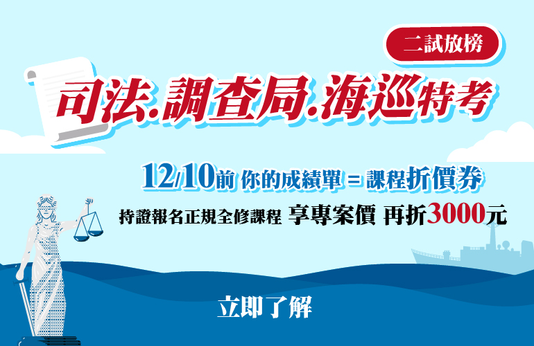 司法/調查局/海巡二試放榜~12/10前憑二試成績單再折3000元