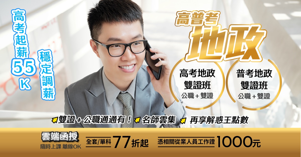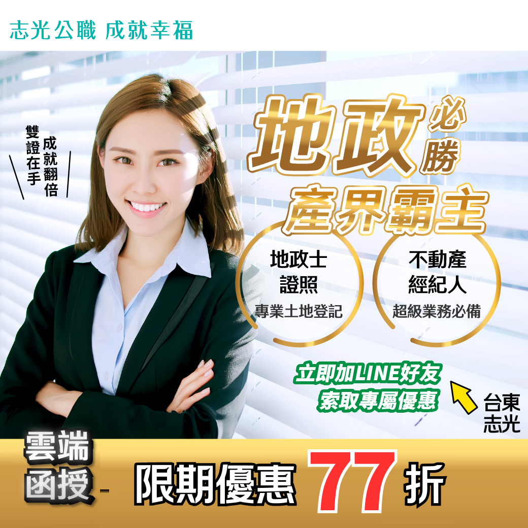 台東志光專辦高普地政+專技不動產經紀人、地政士課程,高普考地政×地政雙證,一年最少有8次考試機會唷,前進公部門,高考起薪55K,還有穩定調薪哦,快洽台東志光洽詢開課資訊