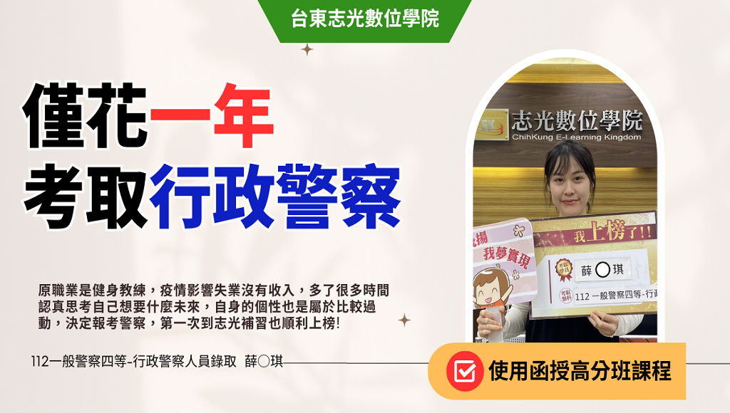 志光補習班的口碑非常良好!公司大有保障,且身邊親朋好友都選擇志光,在台東也有實體補習班,不怕出問題找不到人。下定決心考警察後就去櫃檯詢問,櫃台服務人員也非常有耐心幫我解決問題,於是當下就決定購買課程認真準備警察。選擇函授原因是因為可以在自己選擇的地點,透過手機、電腦、平板等3C產品都可以觀看影片,沒有時間限制,而且可以隨時暫停不怕跟不上進度。覺得很方便於是最終購買超級函授。
